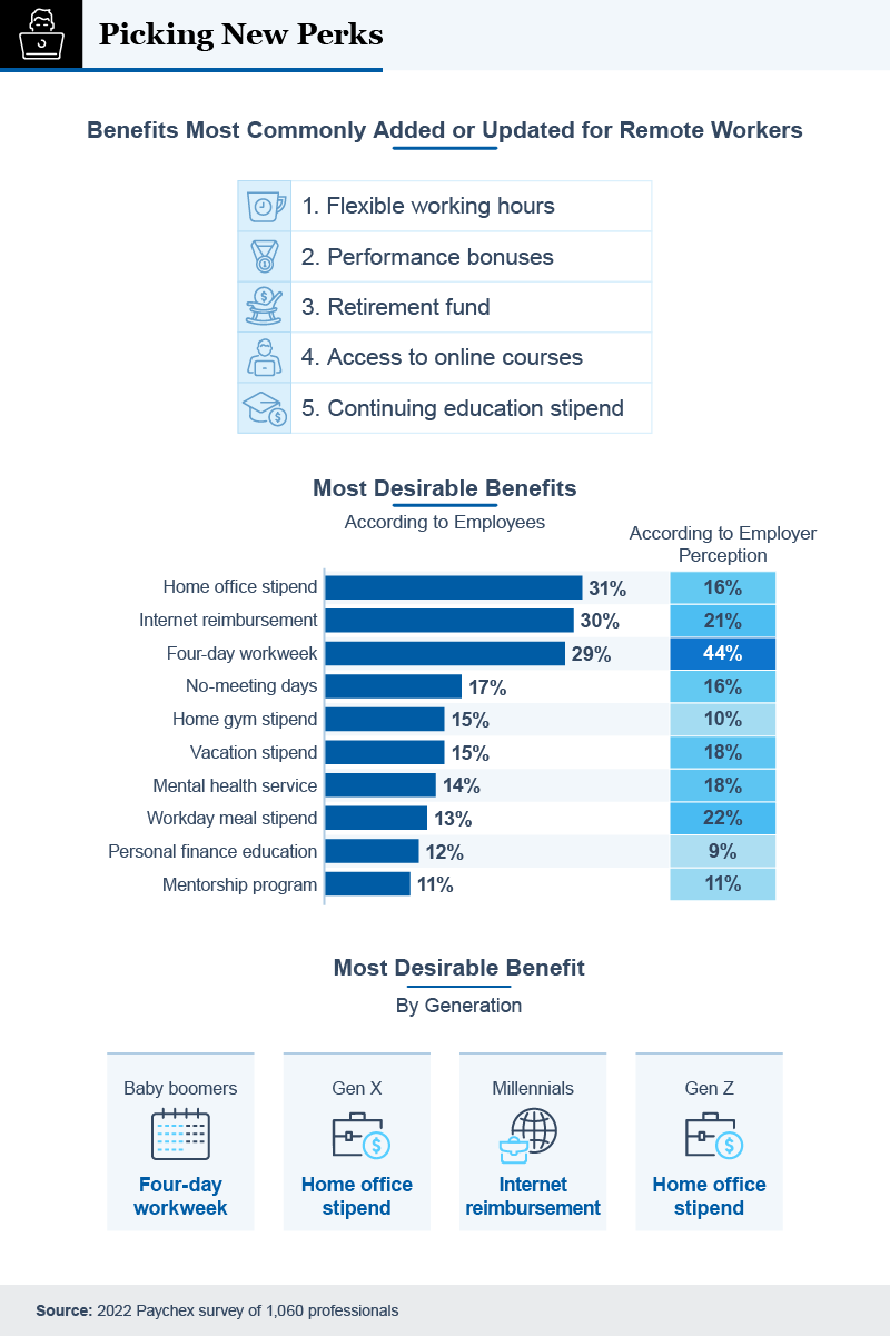 After surveying more than 1,000 employees across the U.S.—from executive through entry level—the team at Paychex has uncovered new insights into the remote employee benefit conundrum. Employees and employers alike were asked how benefits programs have been adjusted to accommodate their new remote workforce and how those decisions have impacted workers and the company at large. Respondents also shared the benefits they'd most like to see incorporated in the future. If you're curious how benefits for remote workers can look, keep reading.